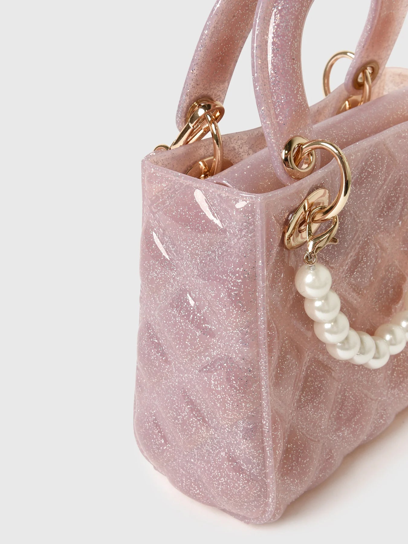 A medium-sized children's purse made from quilted sparkle jelly material with a pearl detail and optional crossbody strap.
