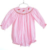 A darling holiday look for your littlest one! This long-sleeve smocked Pink Santa bubble is perfect for Christmas gatherings, Santa photo ops, and festive family moments. Made from soft pink gingham (45% polyester / 55% cotton), it features a beautifully hand-smocked neckline with cheerful Santas and gentle elastic at the legs for a comfy, classic fit.
