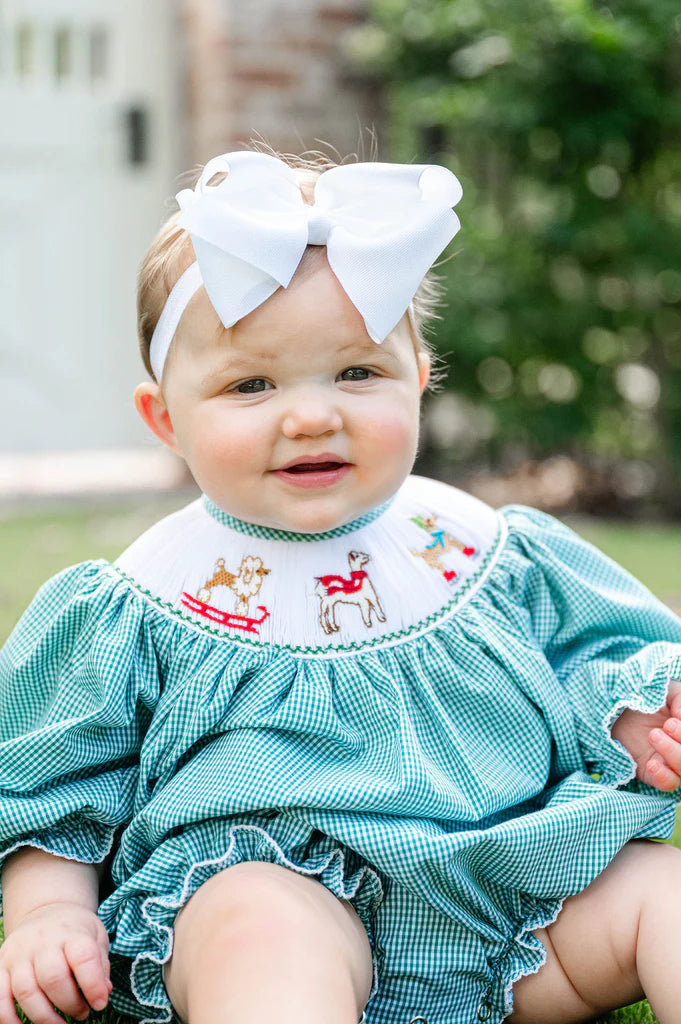 - Hand-smocked Snow Dog detail on green gingham fabric