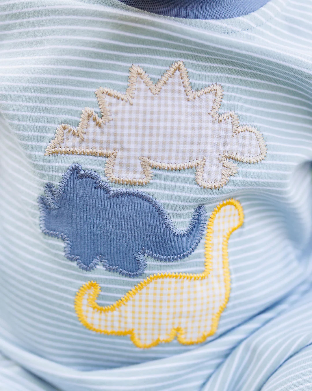 Roar into autumn with our Fall Fossils Romper! This playful long sleeve romper features charming striped patterns and an adorable dinosaur trio applique that little paleontologists will love. Perfect for cooler weather adventures, this cozy one-piece combines prehistoric fun with practical comfort for your tiny explorer.