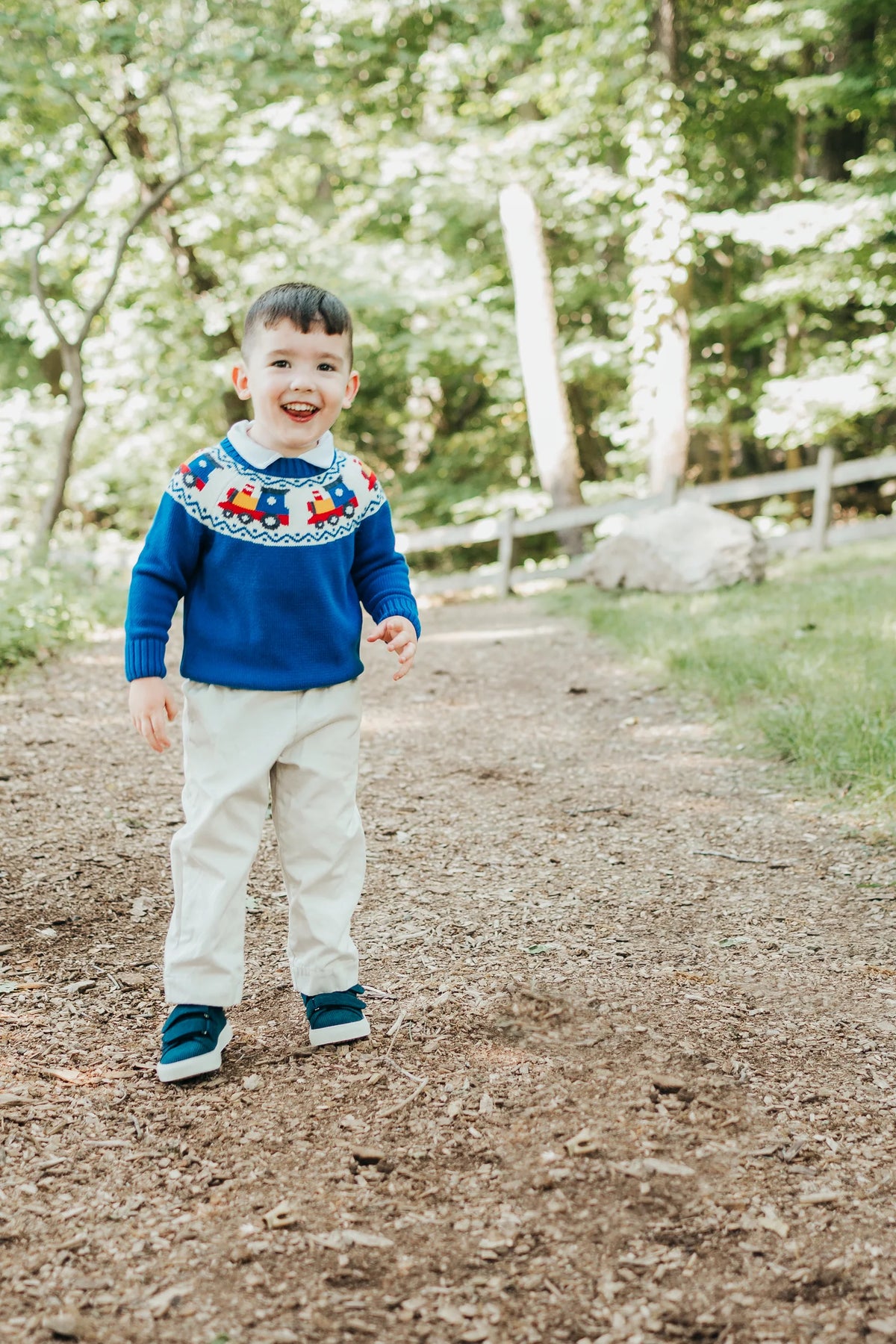 Our boys train sweater will have him looking cozy and cute for fall and winter days! Fit is true to size.