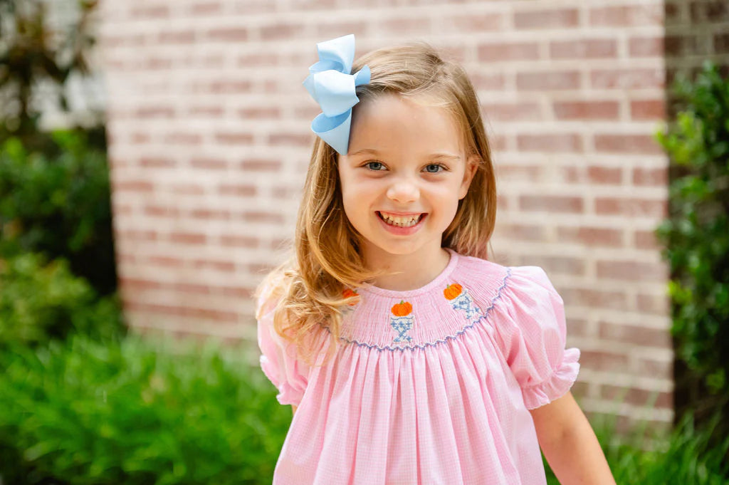 Welcome fall in the most charming way with our Smocked Pumpkins Pink Gingham Bloomer Set. Featuring hand-smocked pumpkins perched atop classic blue ginger jars, this sweet design brings together traditional Southern charm and seasonal style. It is perfect for back-to-school, fall gatherings, and family photos.