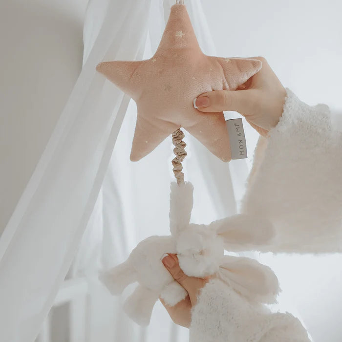 Give the gift of sweet dreams with our enchanting Bunny Music Mobile! This cuddly little bunny, with its soft fur and gentle Brahm's lullaby, is ready to whisk babies off to dreamland. Just give the plush bunny a gentle tug, and let the soothing melody work its magic. The pink foil printed star adds a touch of sparkle and easily attaches to cribs or strollers with a Velcro loop, bringing cozy comfort anywhere. A charming baby shower gift, it's music to every baby's (and parent's) ears!