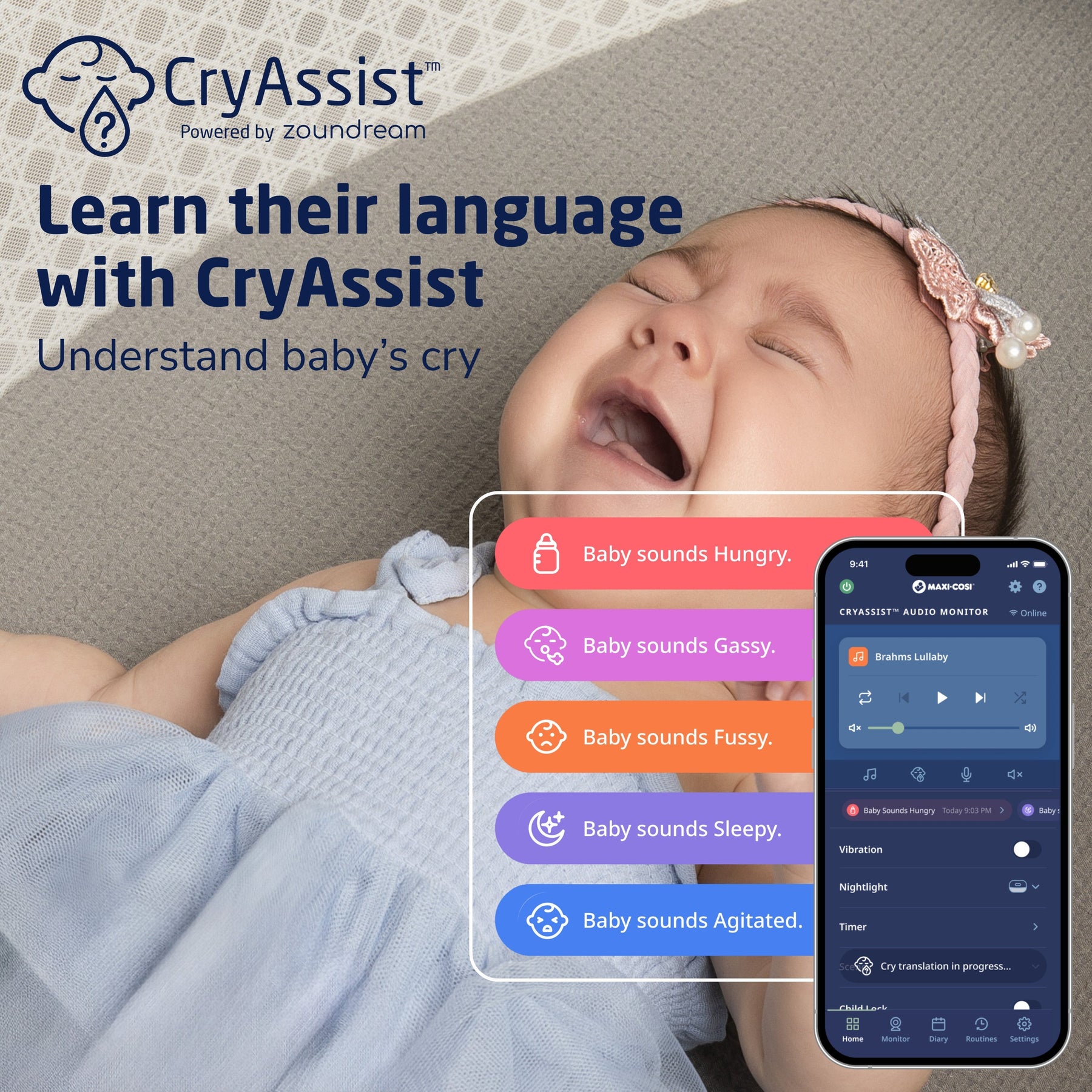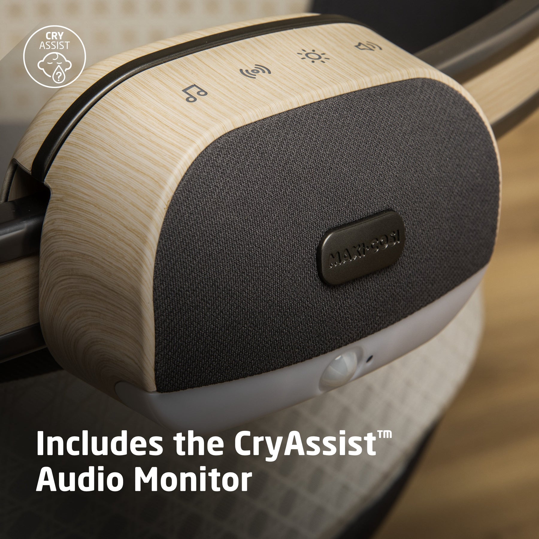 The included Maxi-Cosi Audio Monitor features CryAssist™, powered by Zoundream. Our groundbreaking CryAssist™ technology uses AI to translate your little one’s cries, letting you know if they might be sleepy, fussy, gassy, agitated, or hungry. Other baby monitors just detect a child’s cries––but by knowing what is bothering your baby, you’ll be able to respond to their needs quickly and with confidence. Your little one is communicating with you, and with CryAssist, now you’ll know what they’re saying. Each of CryAssist’s response-based features are optional, ensuring control is always in your hands. With cries and cry data kept anonymous and encrypted on our cloud, private moments are kept between you and baby.