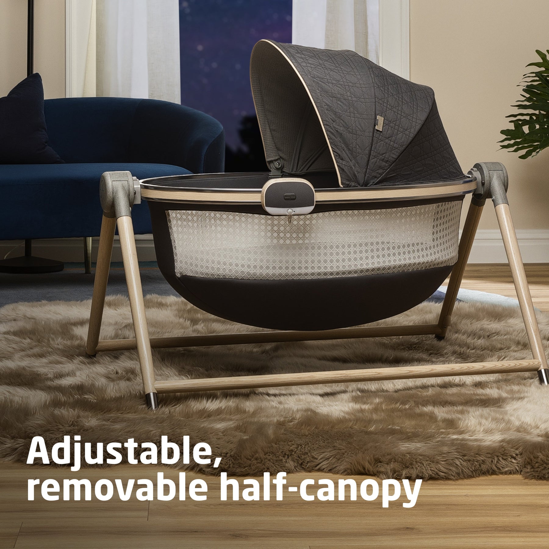 The baby monitor can be attached on either side of the Sibia Bassinet or placed on an adjacent tabletop. A dimmable nightlight with an automatic motion sensor lets you check on your baby without having to disturb them by turning on an overhead light. With a built-in soother that plays 5 different sounds, including lullabies and white noise, and Bluetooth® for music and media streaming, it’s more than just a baby monitor.
